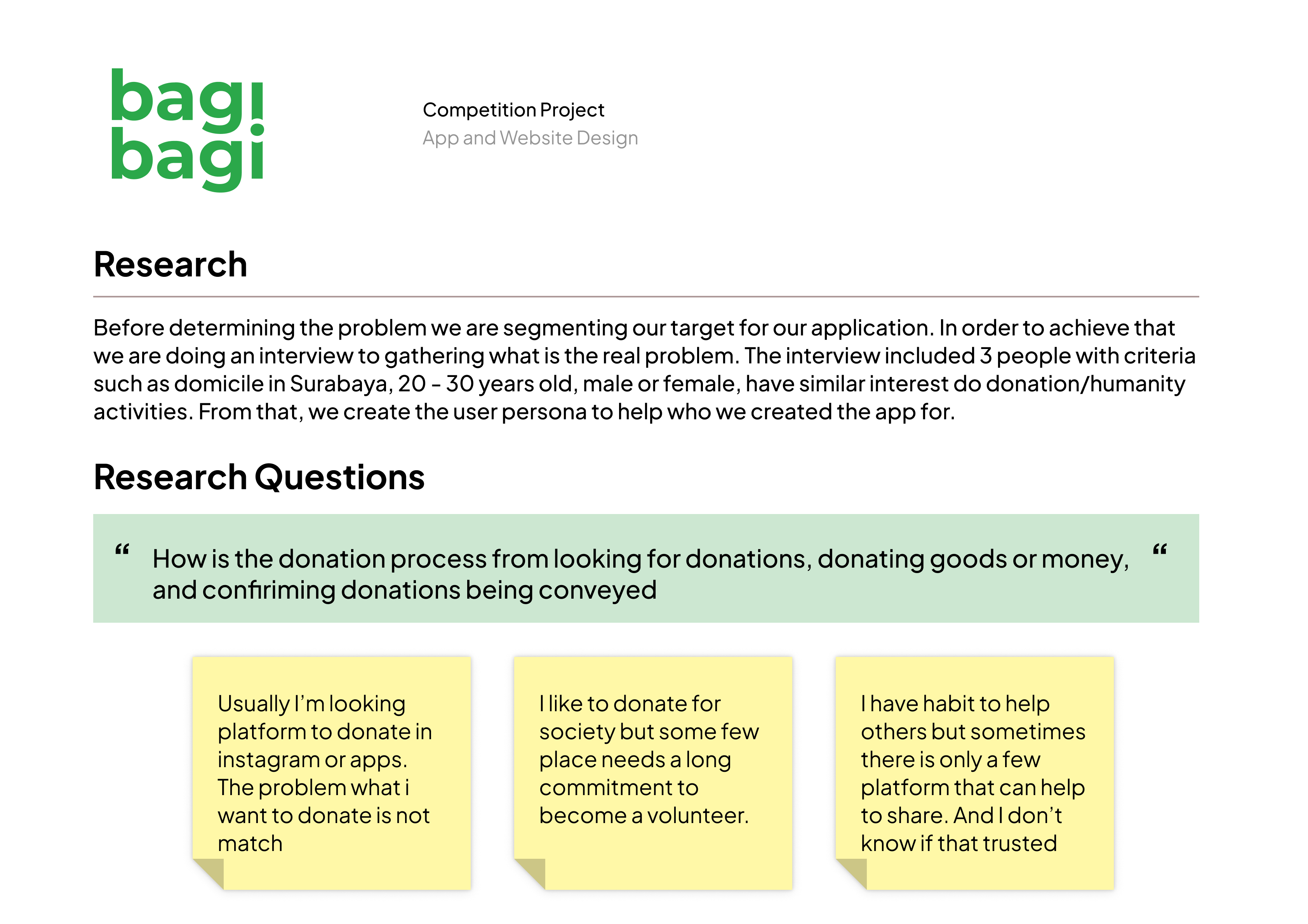 We are segmenting our target for our application before discovering the problem. In order to accomplish this, we are conducting an interview to determine the true problem. Three people were interviewed, all of whom lived in Surabaya, were between the ages of 20 and 30, shared a similar interest in charity and humanitarian work. From there, we develop a user persona to assist the person for whom the app was created.